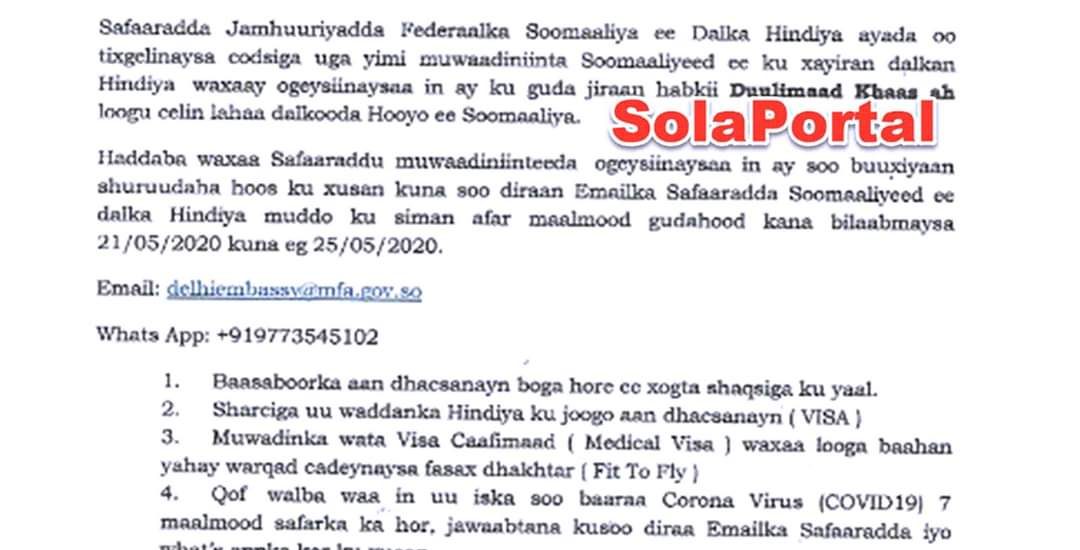 28 May waxaa jiro Duulimaad cusub oo ay soo agaasintay Safaaradda mareekanka ee Muqdisho